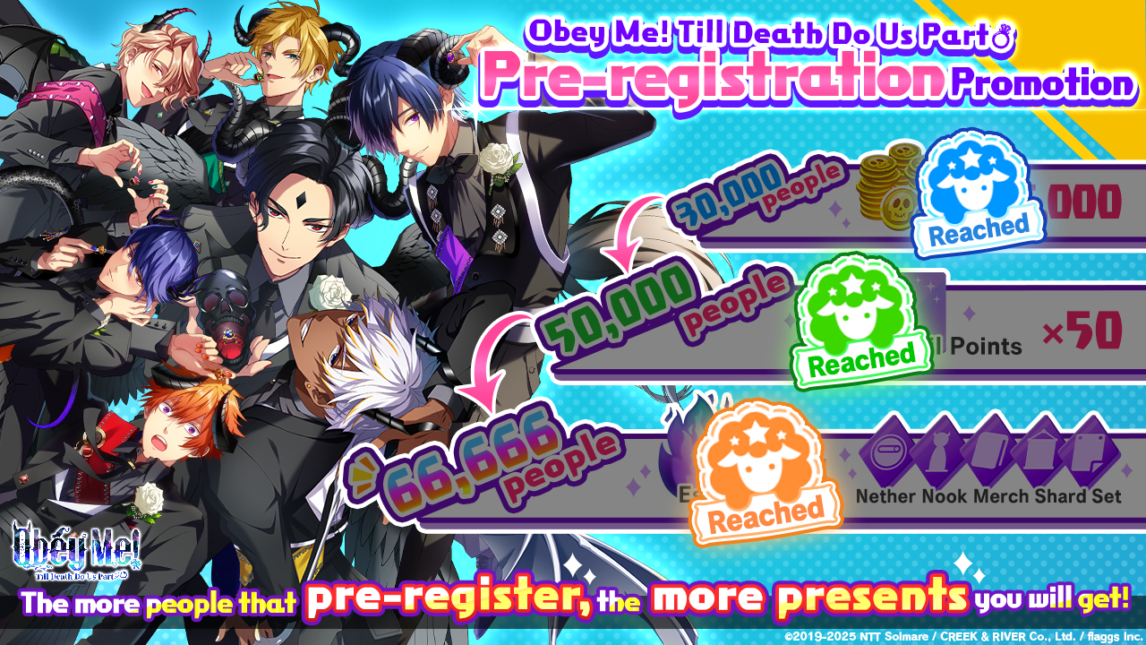 100,000 pre-registrations: Devil Points ×100 + Stardust ×5 + Nether Nook Merch from the Key Visual of Obey Me! Till Death Do Us Part